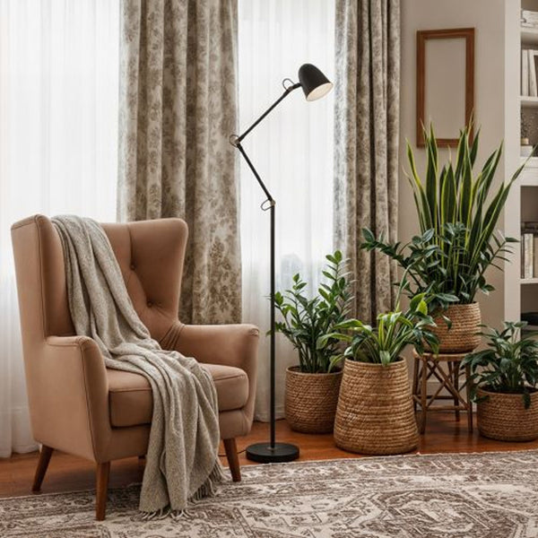 Lampadaire LED élégant en finition noire avec articulation en laiton. L'interrupteur situé sur le câble permet de régler trois niveaux d'intensité lumineuse : 10 %, 40 % et 100 %.