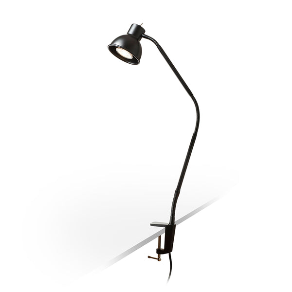 Lampe LED à pince avec abat-jour conique et bras flexible. Le variateur est situé sur la pince de la lampe. L'ouverture maximale de la pince est de 2,5 cm. Trois niveaux de variation de la lumière.