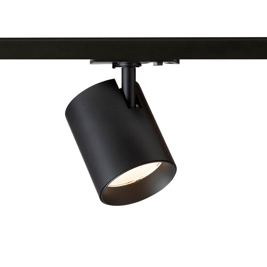 Luminaire tubulaire dimmable pour rail triphasé, avec réglage du cône lumineux par système de zoom de 10 à 60°. Un interrupteur intégré permet de régler la température de couleur : 3000 K, 4000 K ou 5000 K. Intensité réglable via variateur TRIAC.