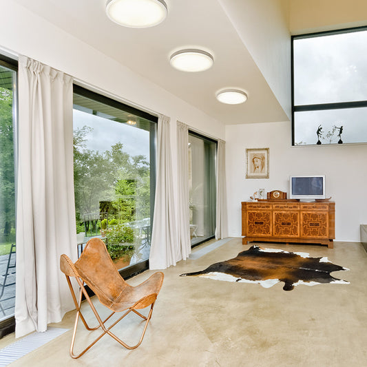Luminaire encastrable sans cadre avec diffuseur en acrylique laiteux, légèrement en relief par rapport au plafond. Convient aux environnements humides.