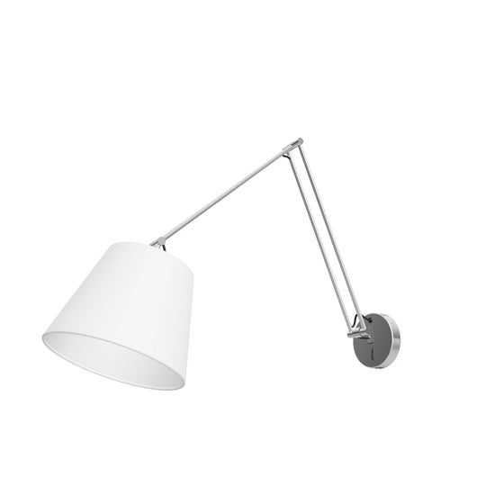 Applique murale à double bras avec abat-jour en textile. L'interrupteur est situé sur la base.