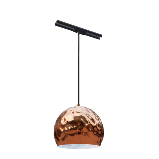 Suspension avec abat-jour en métal martelé. Face extérieure finition cuivre, face intérieure laquée blanc. Câble en PVC noir, équipé d’un adaptateur pour rail monophasé.