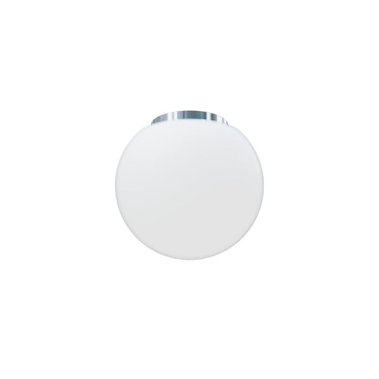 Plafonnier en verre opale sur une base chromée. Convient aux environnements humides.