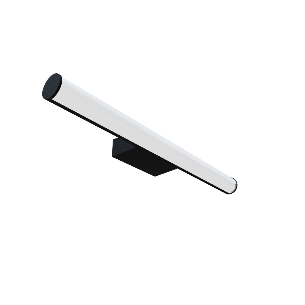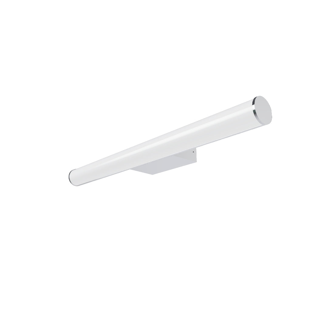 Luminaire mural LED tubulaire pour salle de bains, monté sur une base rectangulaire. Un interrupteur situé à l’intérieur de la base permet de régler la température de couleur: 3000 K ou 4000K.