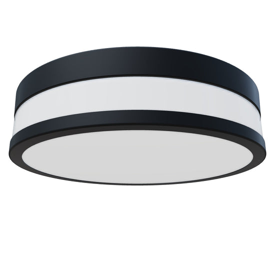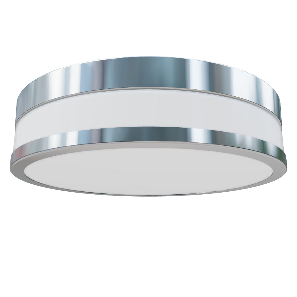 Plafonnier cylindrique en verre opale sur une base chromée adapté aux endroits humides.