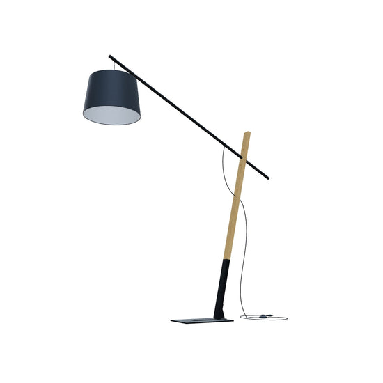Lampadaire design massif adapté aux grands espaces, alliant bois, métal et abat-jour en textile.