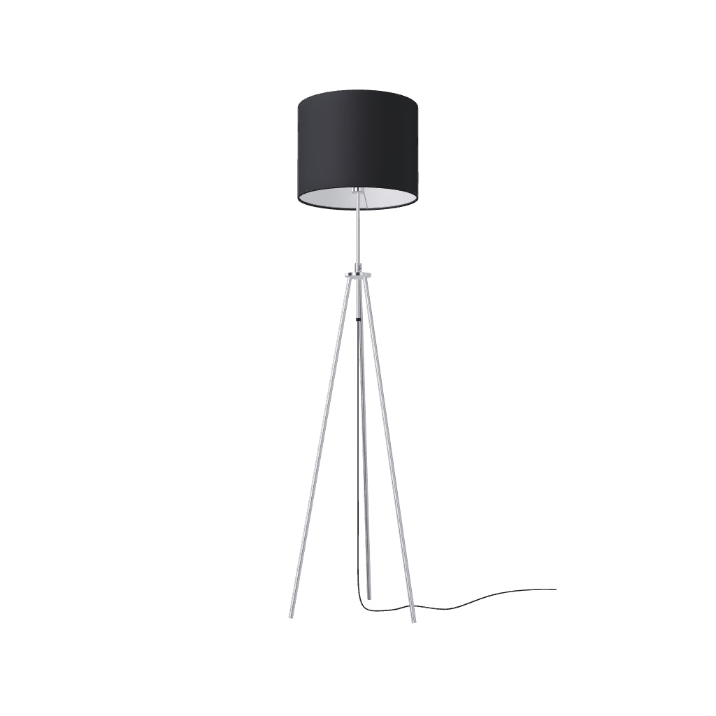 Lampadaire sur trépied réglable en hauteur. Abat-jour en textile pour ampoule à culot E27.
