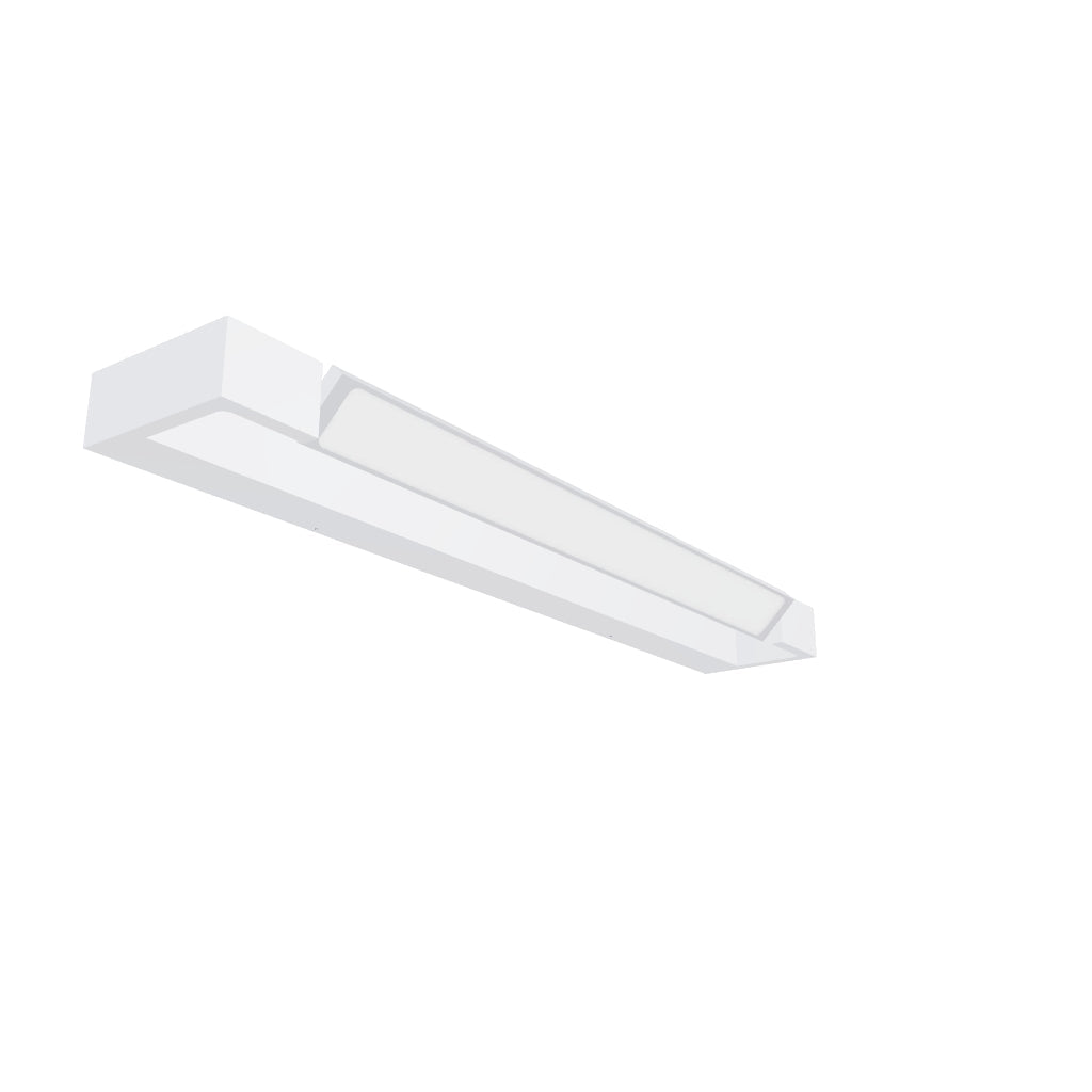 Luminaire LED linéaire conçu pour installation au-dessus d’un miroir. La partie avant du luminaire est orientable sur l’axe horizontal. Convient aux environnements humides.