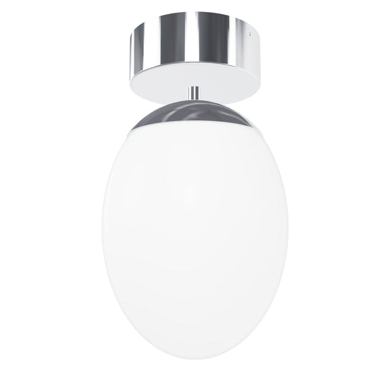 Plafonnier ovale en verre avec une base chromée adapté aux endroits humides.