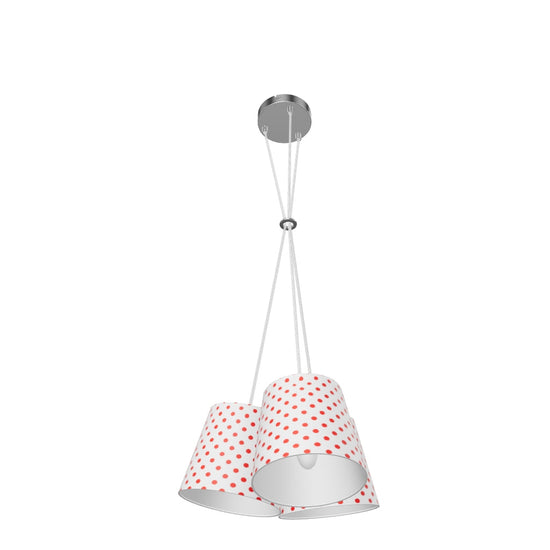 Suspension avec trois abat-jours en textile fixés sur une base commune, pour ampoules à culot E14.
