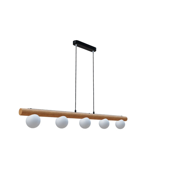 Suspension avec cinq abat-jours en verre opale fixés sur une base en bois. La rosace de plafond est en métal laqué.