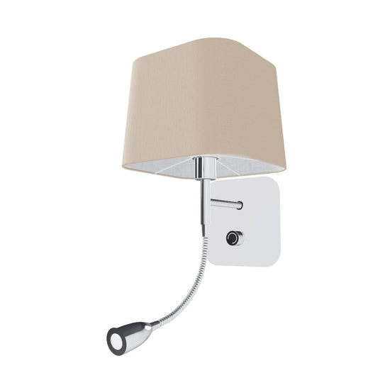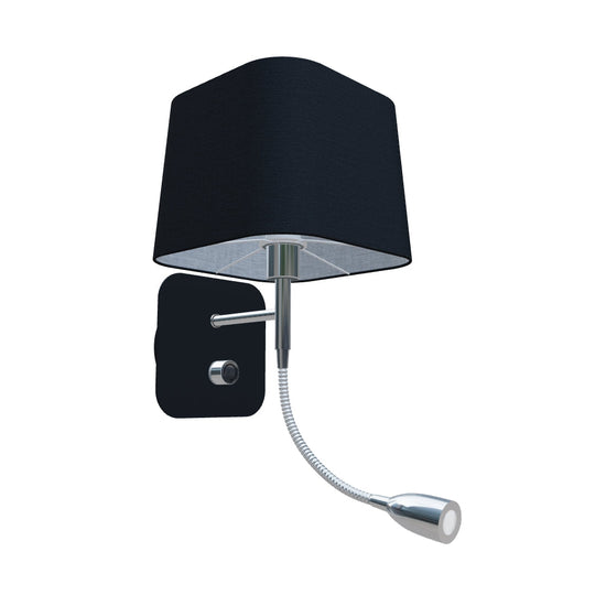 Luminaire mural avec abat-jour en textile de forme carrée, complété par un bras flexible équipé d’un réflecteur LED. Le luminaire dispose de deux sources lumineuses, commandées séparément par un interrupteur rotatif situé sur la base carrée.