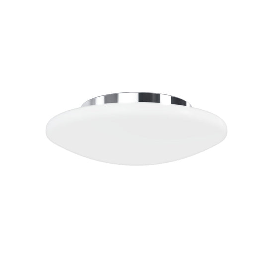 Plafonnier LED en verre opale sur une base chromée adapté aux endroits humides.