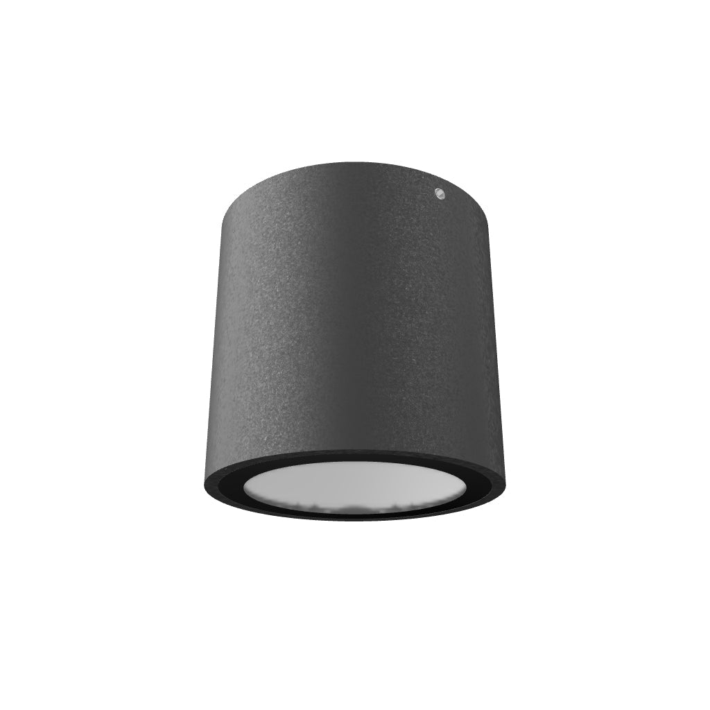 Plafonnier LED d’extérieur, de forme cylindrique, avec verre de protection transparent bordé de noir.