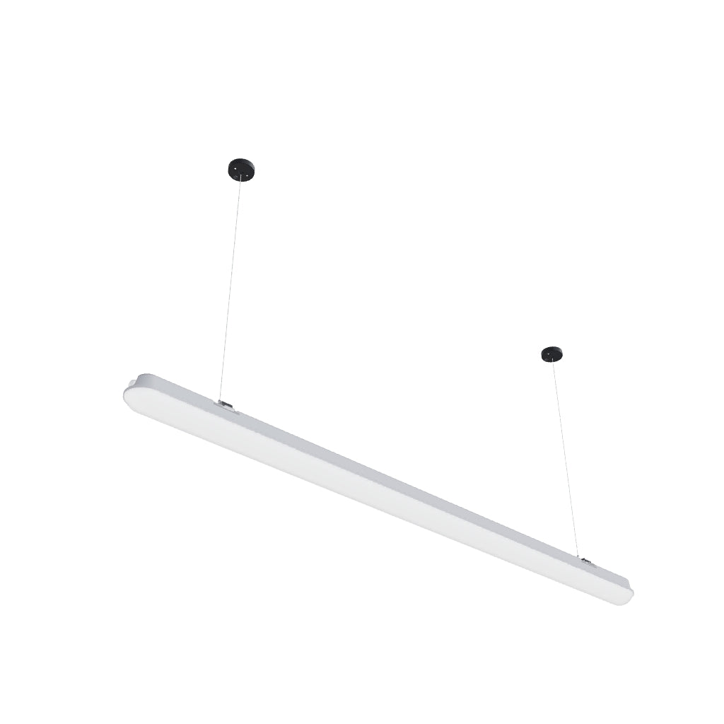 Luminaire LED linéaire industriel, prévu pour un montage au plafond ou en suspension avec le kit G13672. Haute performance et indice de protection IP65. Livré sans kit de suspension ni câble d’alimentation. Possibilité de connexion en série entre luminaires.