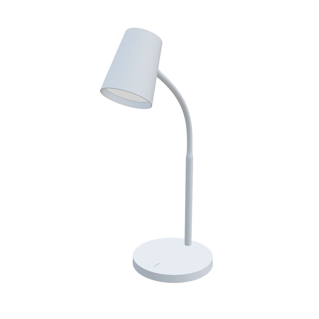Lampe de bureau LED avec abat-jour conique et bras flexible. Le variateur est situé sur la base de la lampe. Trois niveaux de variation de lumière.