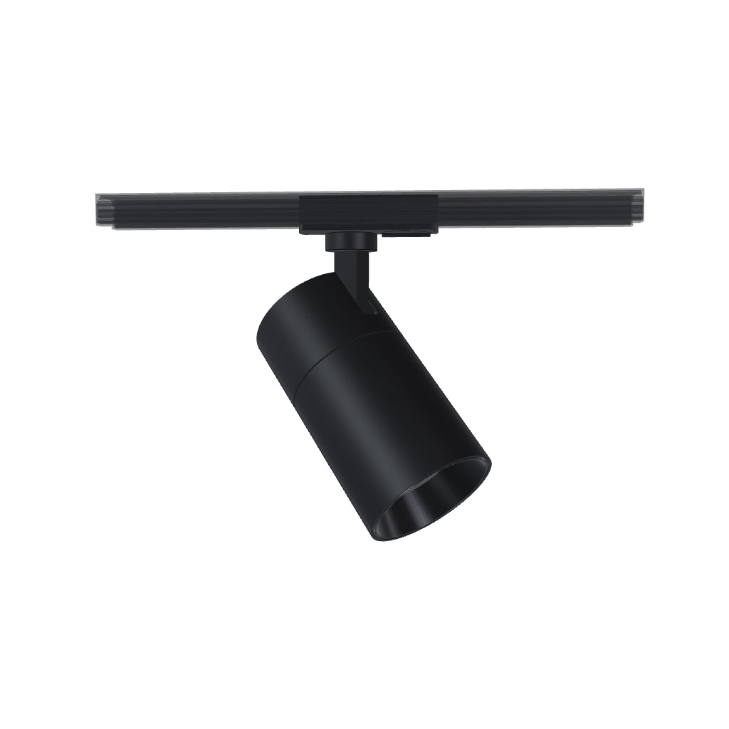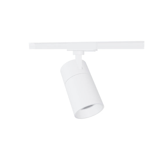 Luminaire cylindrique à intensité variable pour rail monophasé, avec possibilité de sélectionner la couleur de la lumière : blanc chaud (WW), blanc neutre (NW), blanc froid (CW). Intensité réglable via variateur TRIAC.