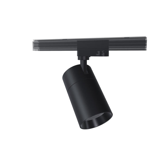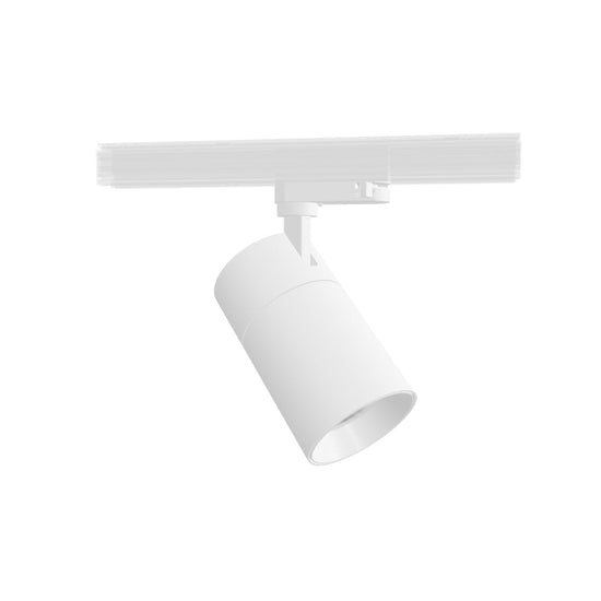 Luminaire cylindrique à intensité variable pour rail triphasé, avec possibilité de sélectionner la couleur de la lumière : blanc chaud (WW), blanc neutre (NW), blanc froid (CW). Intensité réglable via variateur TRIAC.